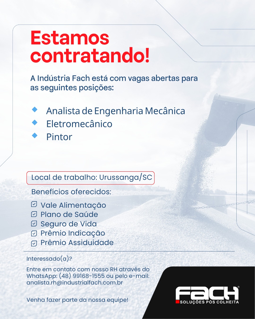 A FACH está em busca de novos colaboradores nas vagas de analista de engenharia mecânica, eletromecânico e pintor. A empresa oferece benefícios como vale alimentação de R$ 300,00, prêmio assiduidade de R$ 500,00, bônus de carreira, plano de saúde São José e horário flexível, de segunda a sexta-feira, com saída na sexta às 16 horas. De acordo com Jaine Cândido, analista de Recursos Humanos, os interessados podem entrar em contato através do WhatsApp (48) 99168-1555.