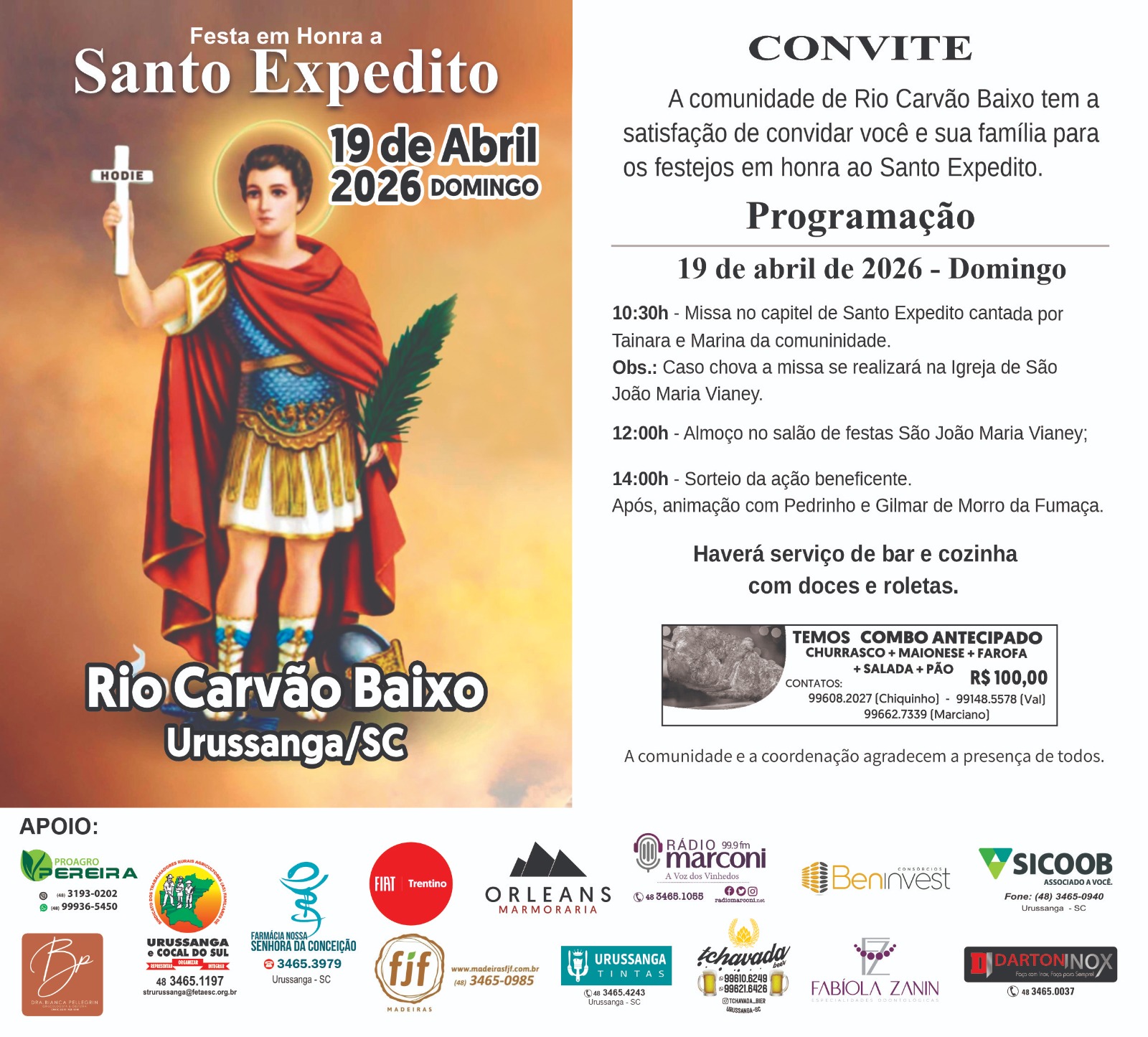A Festa em Honra a Santo Expedito será celebrada na comunidade de Rio Carvão Baixo, em Urussanga, neste final de semana. As celebrações ocorrem no domingo, dia 19, com missa, almoço festivo e sorteio da ação beneficente. De acordo com o coordenador do Conselho de Assuntos Econômicos Paroquial (Caep), Sidnei Casagrande, o Chiquinho, a festa vem sendo preparada há meses. “A gente sabe que tem muito devoto, a gente tem certeza que vai ser uma festa grande, então a gente tem que se preparar”, disse. A festa começa a partir das 10h30, com a celebração da santa missa no Capitel de Santo Expedito. Caso chova, a missa vai acontecer na igreja de São João Maria Vianey. Logo após, às 12 horas, será realizado o almoço no salão de festas.